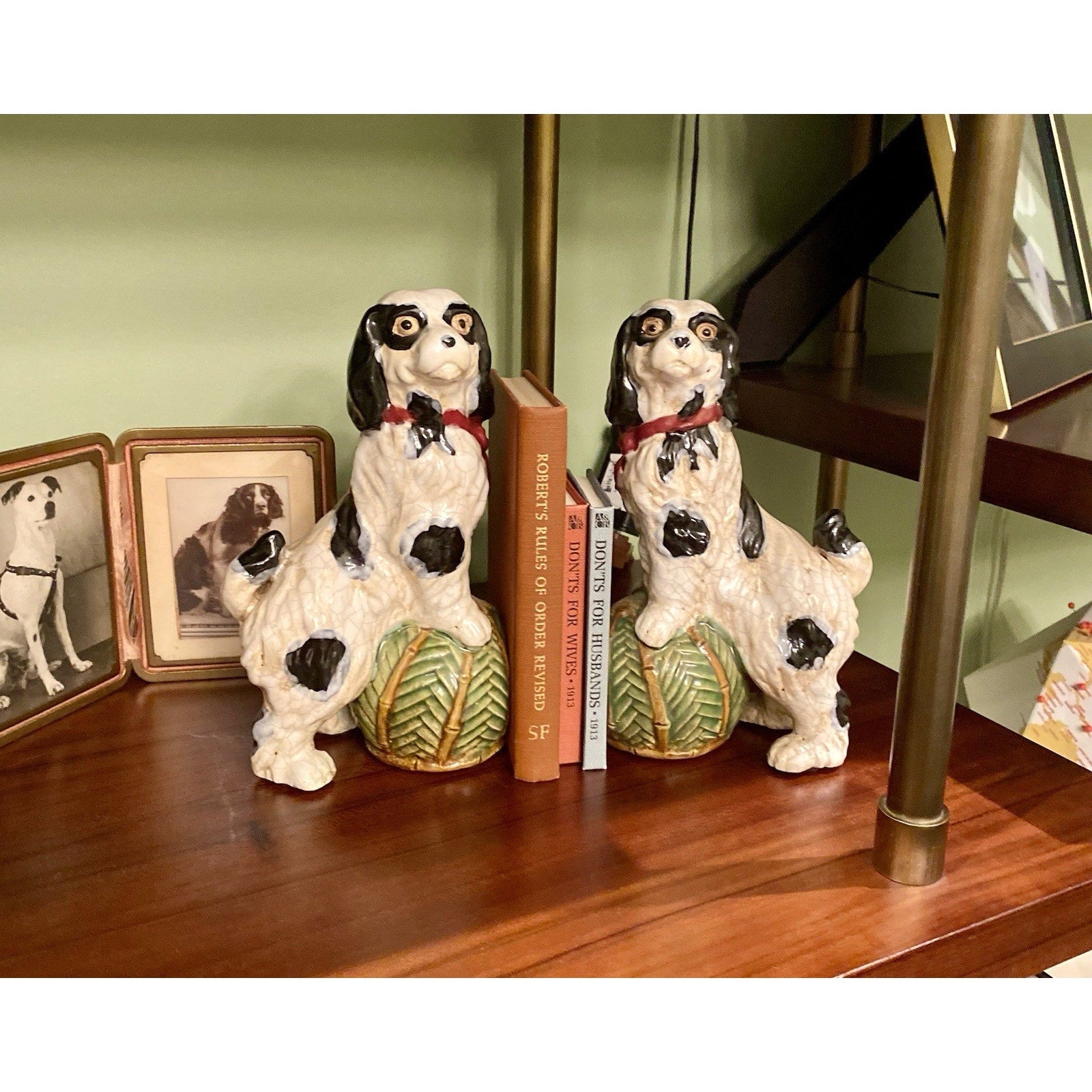 Antique Majolica Staffordshire Style King Charles Spaniel Dogs Ceramic Bookends