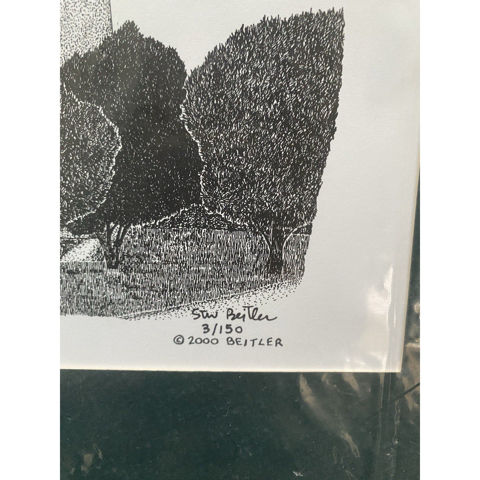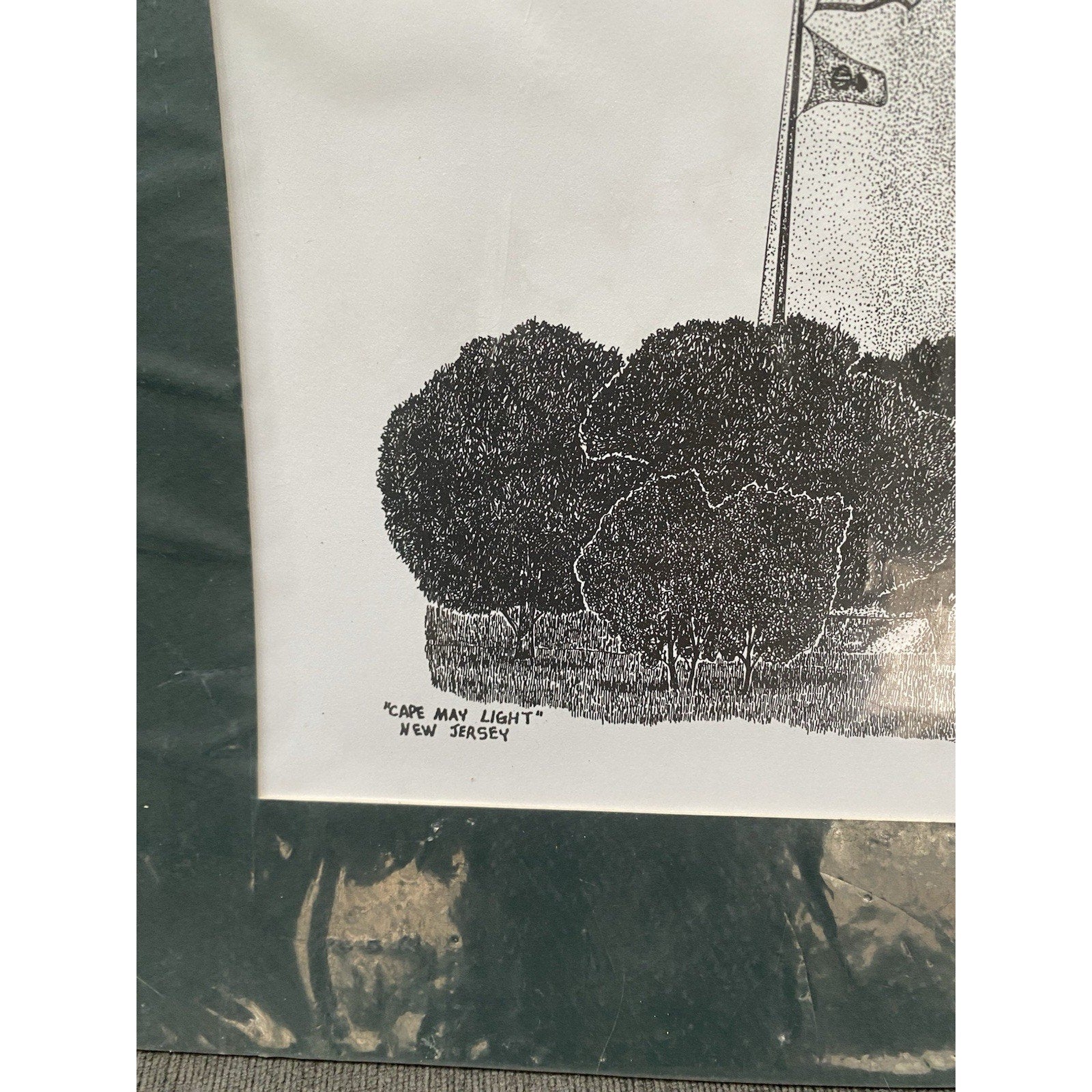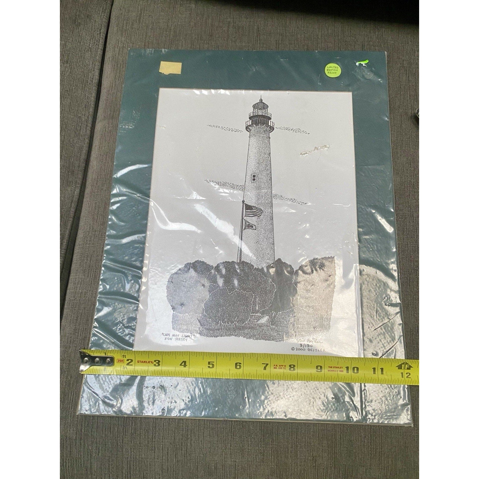 The product is a limited edition 3/150 print of the Cape May Lighthouse by artist Stew Beitler. This art print in a forrest green captures the historic and iconic lighthouse in a unique and detailed manner, making it a valuable and sought-after piece for art collectors and enthusiasts. The limited edition aspect adds exclusivity and rarity to the print, further enhancing its appeal and value within the market of art prints.