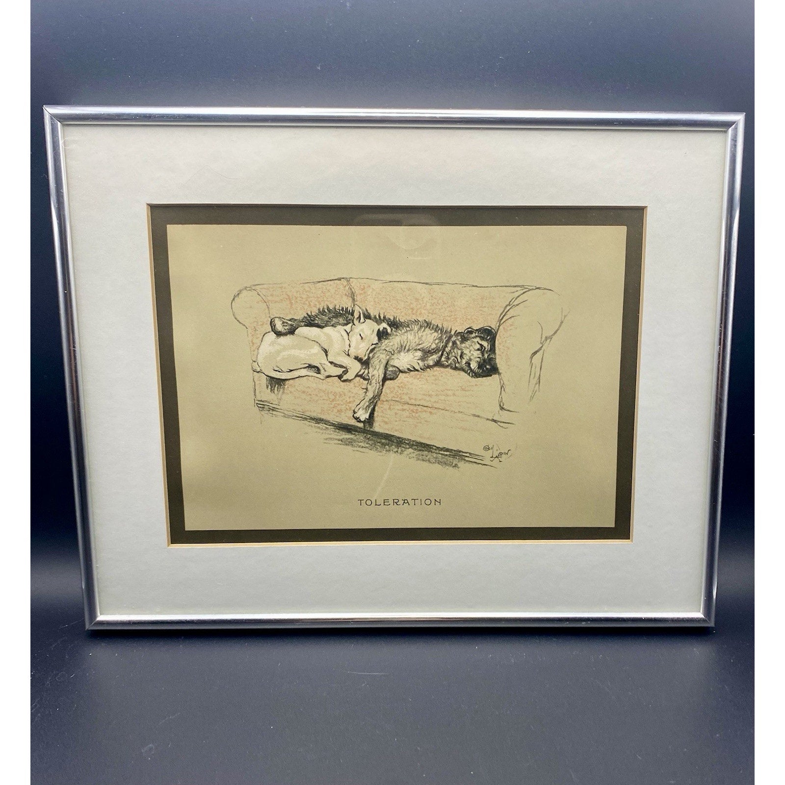 The piece is part of Aldin's "Sleeping Partners" series featuring chalk and charcoal drawings of two dogs resting together on a sofa.