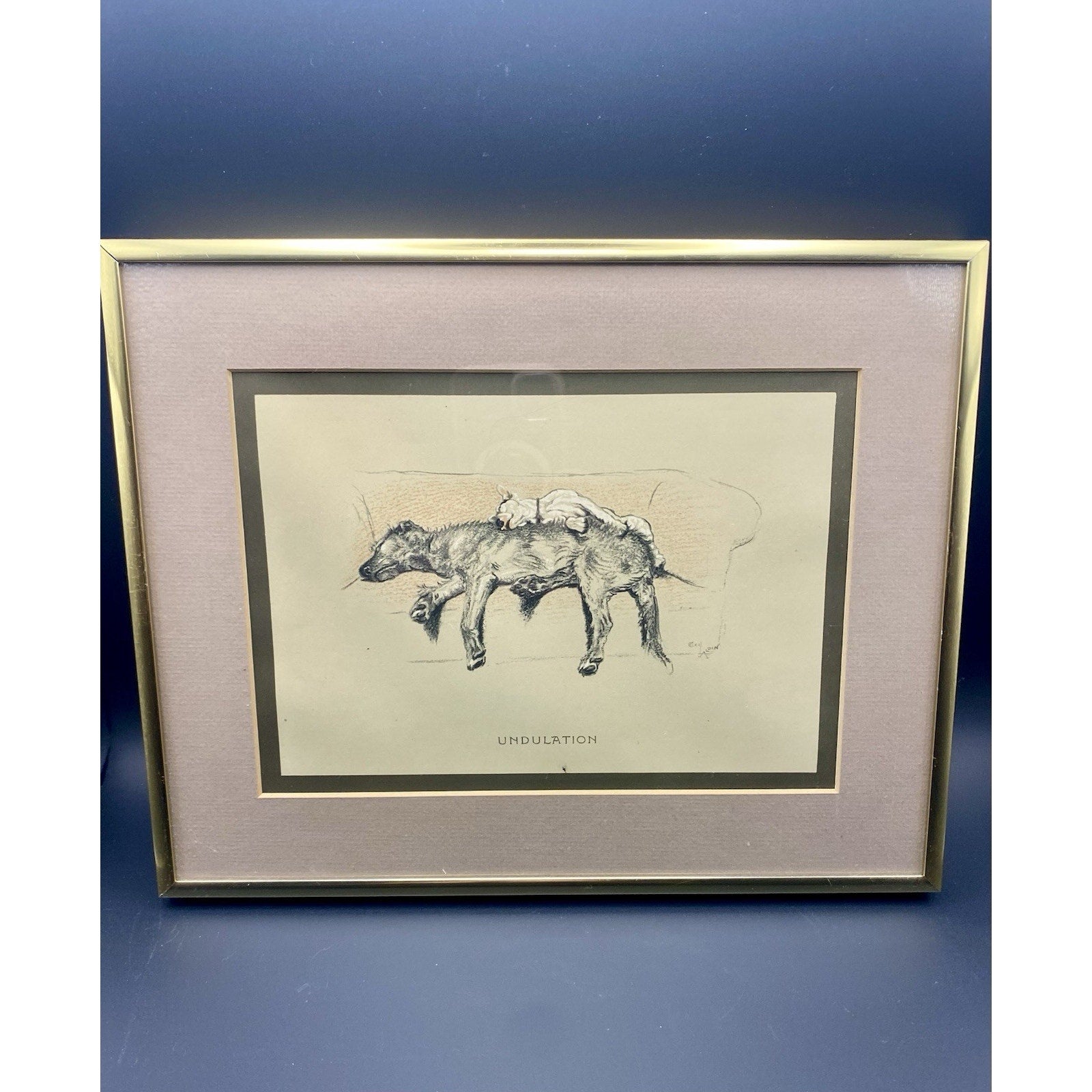 This Cecil Aldin print from 1929 features a Bull Terrier and a Wolfhound, making it a unique and collectible piece for animal lovers and art enthusiasts. The matted print, signed in plate, showcases the artist's vintage style and attention to detail. As an original lithograph from a limited edition out of print book, this piece captures the essence of the early 20th century and is sure to be a standout addition to any art collection.