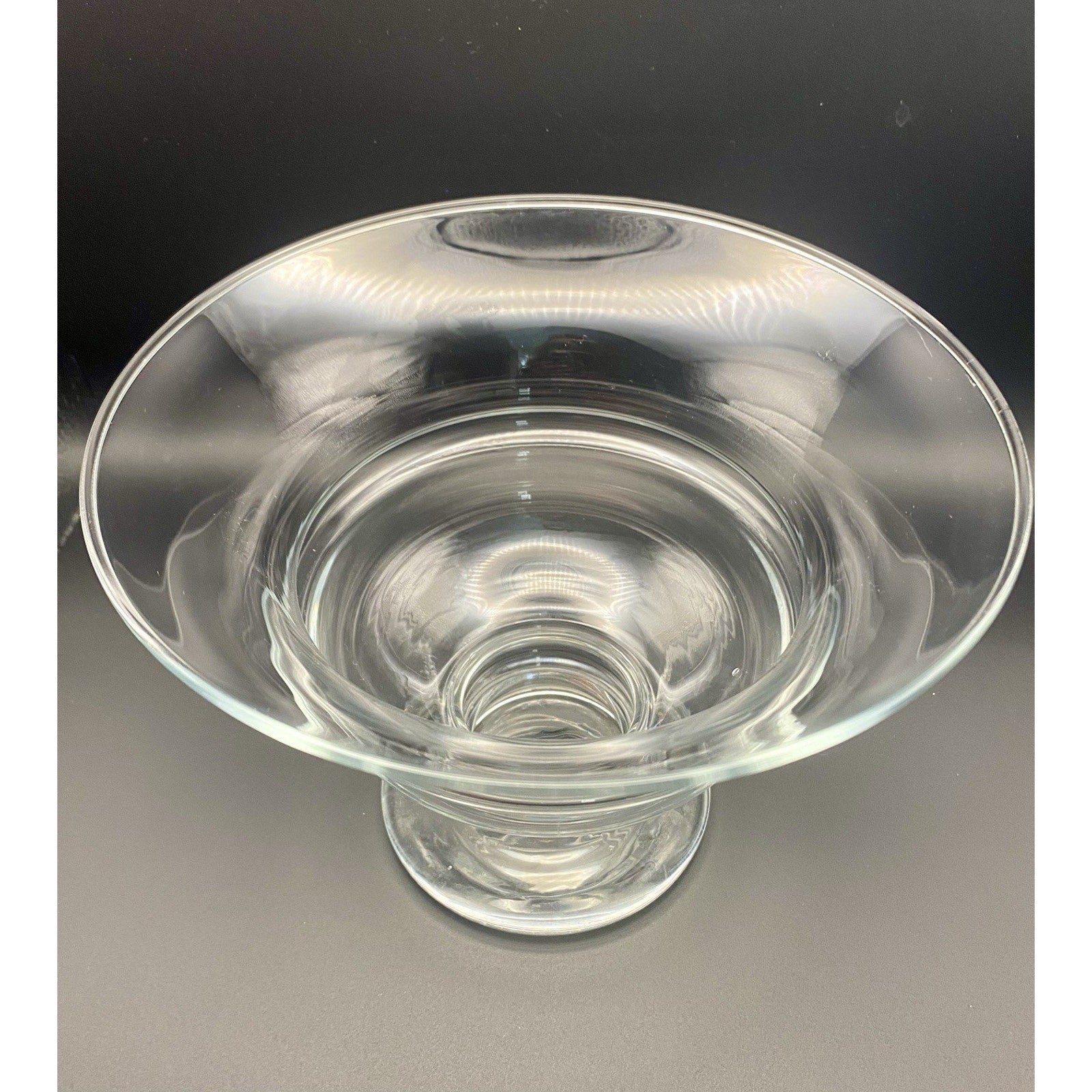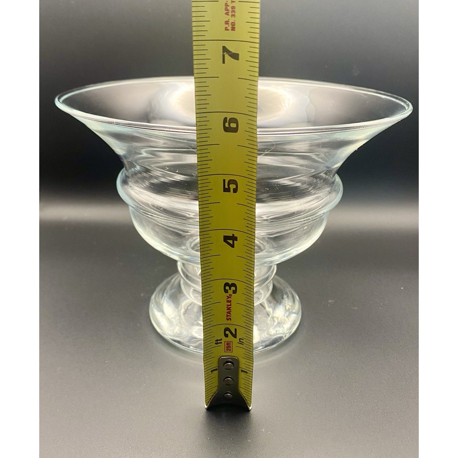 The Clear Hand Blown Glass Pedestal Bowl is a round, footed bowl made of glass, with a glossy finish and a diameter of 7.5 inches. It stands at a height of 5.75 inches, making it a unique and elegant addition to any kitchen or dining table. The clear color adds a touch of sophistication, making it perfect for serving or displaying fruits, candies, or potpourri. This hand-blown bowl is both functional and decorative, ideal for those who appreciate artistry and craftsmanship in their dinnerware.