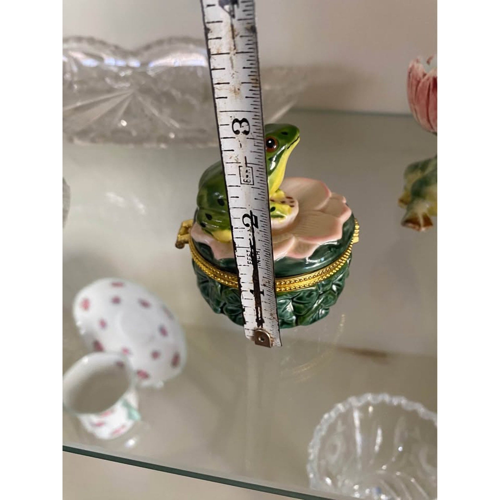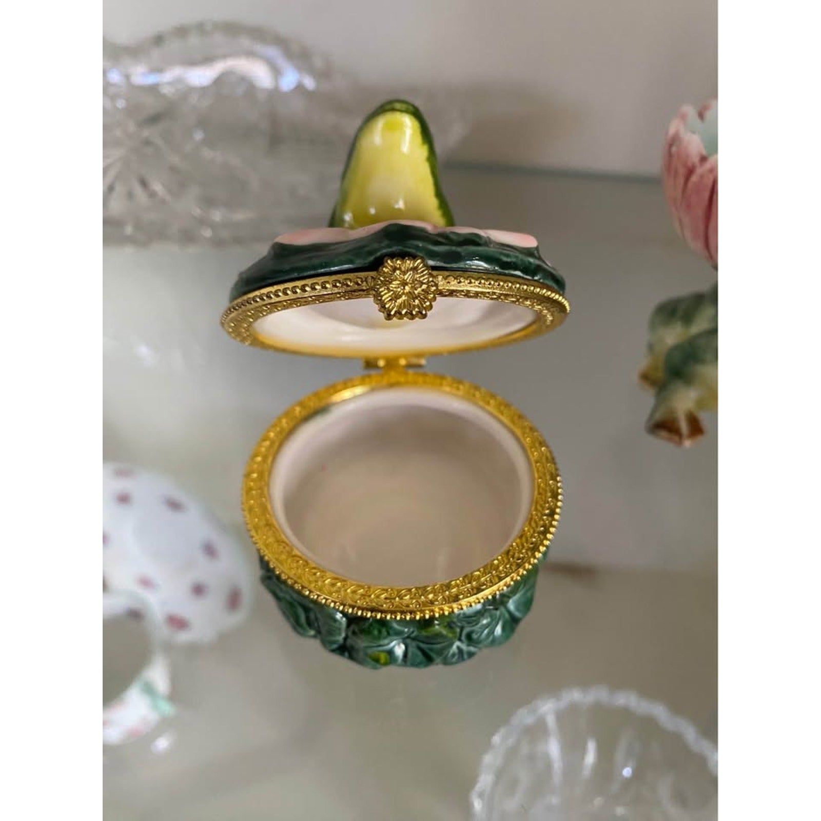 porcelain hinged trinket box featuring a green frog perched on a lily pad.
